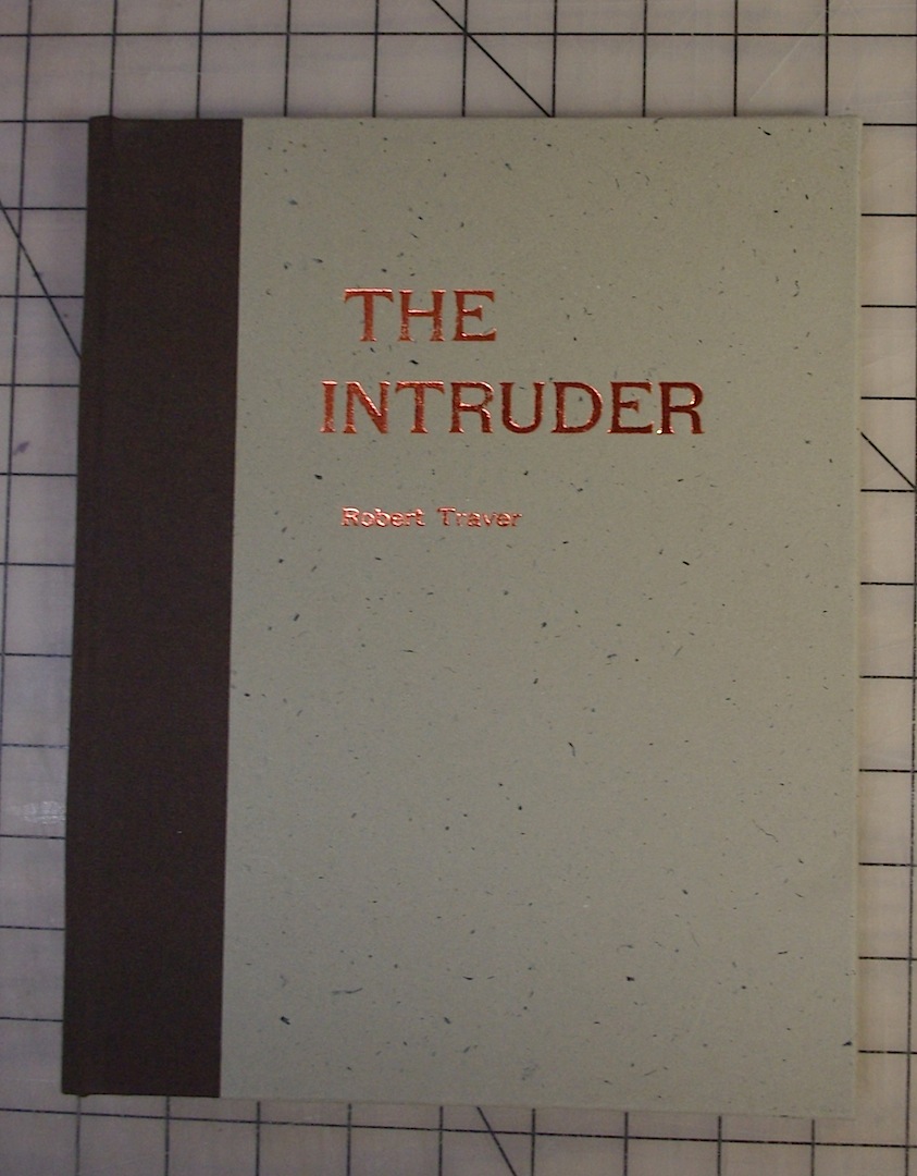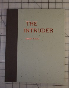 Work continues on binding The Intruder. Fifty copies of the regular edition have been sewn onto straps and have the super attached at the spine along with the 20 copies of the deluxe edition. The cover boards, cloth spines and cover paper are all cut and ready for a case making marathon today. A few posts down I was still musing on what cover paper I should use for the regular edition of the book. I hope no one took me seriously about the cork (how long could that really last? I’m talking centuries here.) I’ve settled on a lovely sheet from Twinrocker called Rustler made of cotton and cereal fiber. Kathryn and Howard at Twinrocker have been making fine papers since 1971, this sheet is no disappointment. Here’s yet another prototype binding as well: