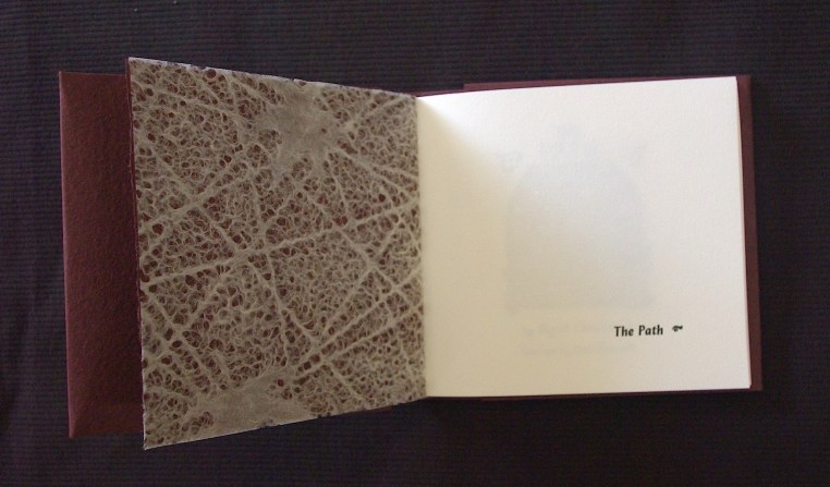 “The Path” now completed 09 Thursday May 2013 Original size at 1841 × 1080 ≈ Leave a comment Half title page Shown with the “Dark Roast” flyleaf and Japanese Lace paper with a leaf motif.