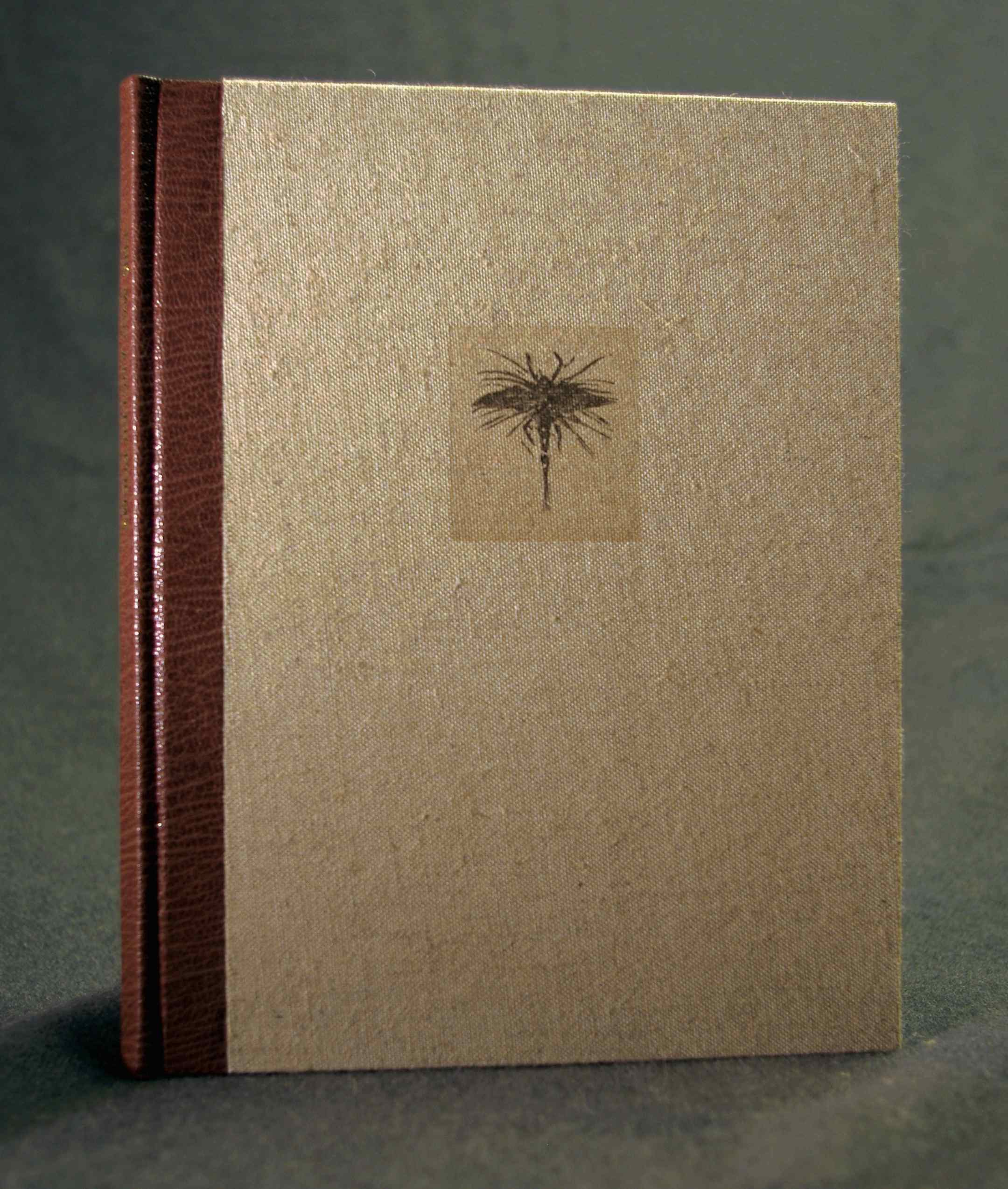 Cover of the book “The Mad Angler Poems” by Michael Delp. Varnished panel overprinted with the “Brown Drake” wood engraving on a cotton/linen book cloth with Harmatan goat skin spine.