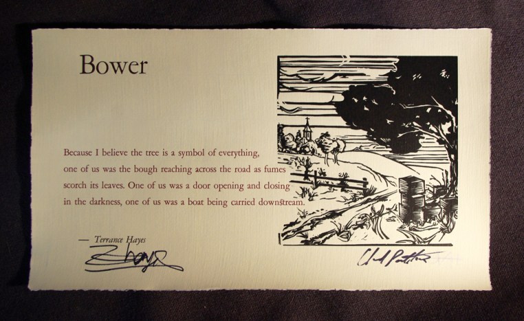 Bower by Terrance Hayes. Three colors on mould-made German Zerkall Frankfurt cream paper, 15 x 8.5 inches, hand set in Garamond in 24 and 72pt type and printed on a Vandercook 219OS.
