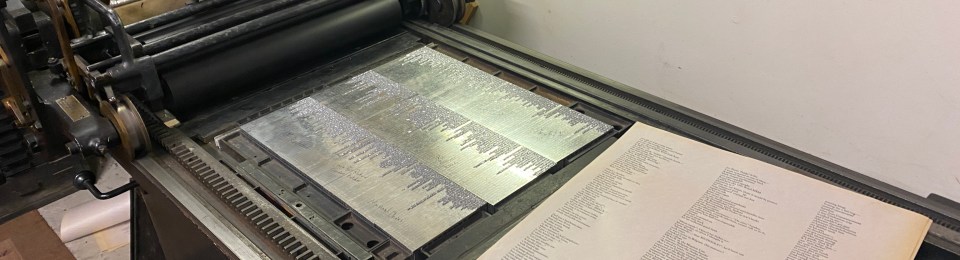 James approached me about his book well over a year ago and details around production finalized before heading to France last September so I could at least start on a couple of the wood engravings while overseas. In December, before and after Oxford, I was busy on my Linotype casting the text for the book. New acquisitions of logotype and diacritic matrices for one of the house typefaces, Garamond, have made typography on the machine equal to hand setting for letter fitment and it is always a joy to print from fresh type. The book will come in just under 100 pages for the 36 poems with an introduction from Toby Olson and will be printed on Hahnemühle Biblio paper in 12pt Garamond, an edition of 50 books in a 6.5 x 10 inch format. I’m still working on those wood engravings (the one shown below is a mere 2.5 x 2.25″) but the plan is for 3 or 4 within the book to illustrate. With luck the book will be in the bindery by June and will be available shortly after. Stay tuned here for more production pictures and details in the months to come.