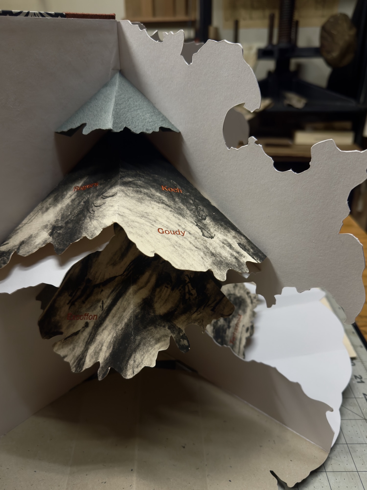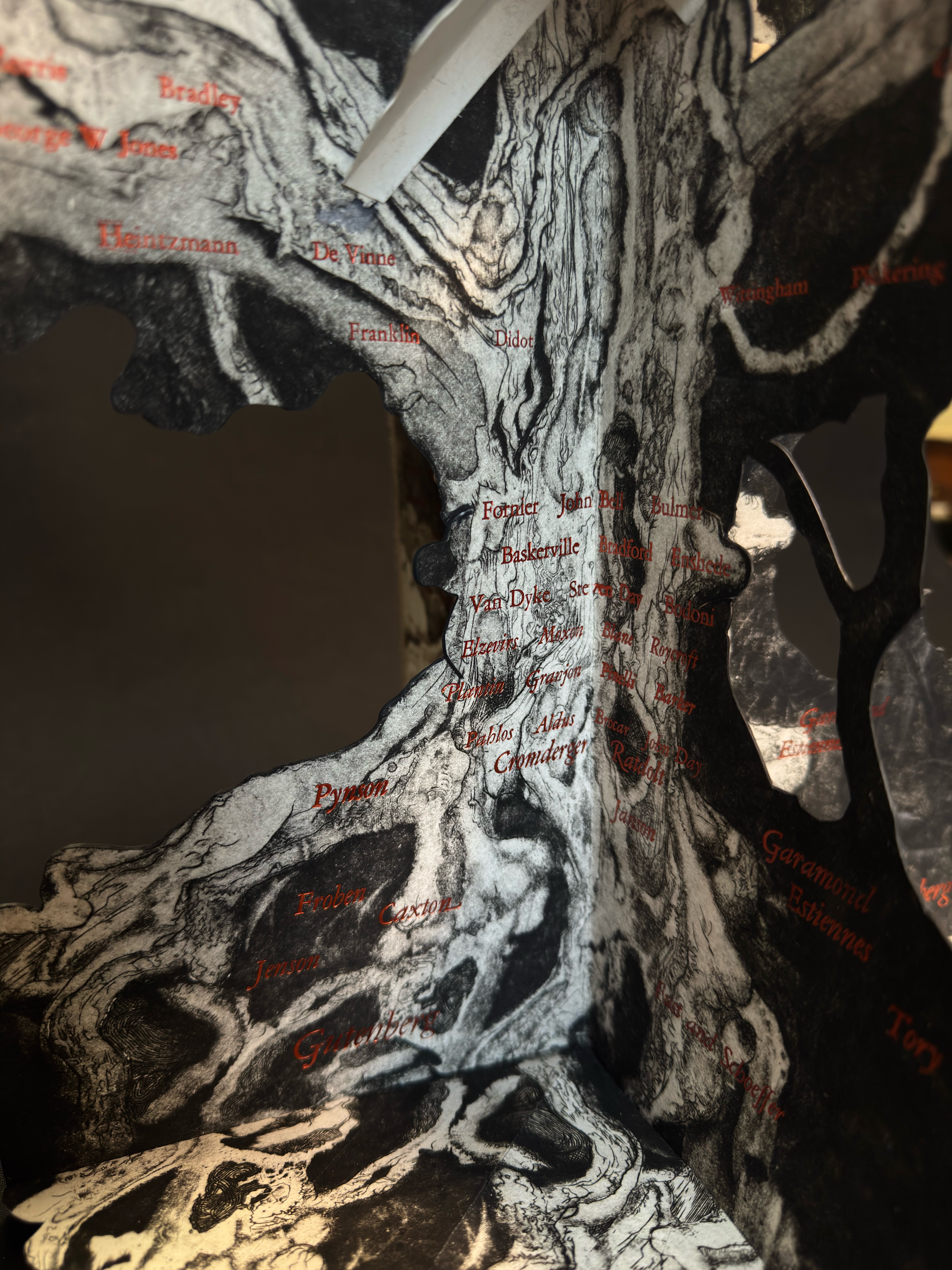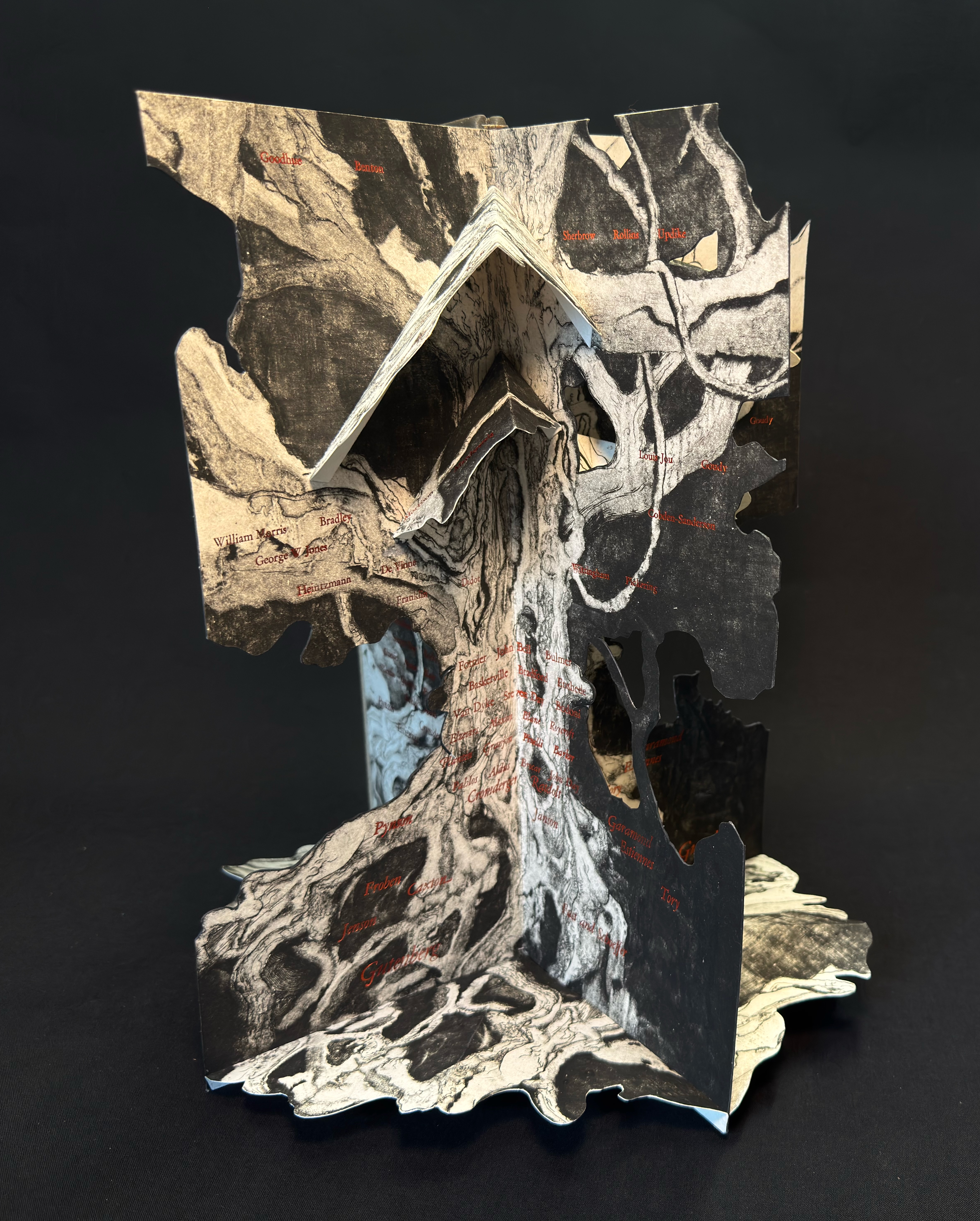 A year ago I presented a first draft of this project and I’m pleased with the progress of my 360 degree wrap around pop-up structure depicting a curated history of typographic luminaries. From Johannes Gutenberg to Linn Boyd Benton this is an attempt to create a loose family tree tracing innovations in type design, type cutting and type founding from the 14th to early 20th century.