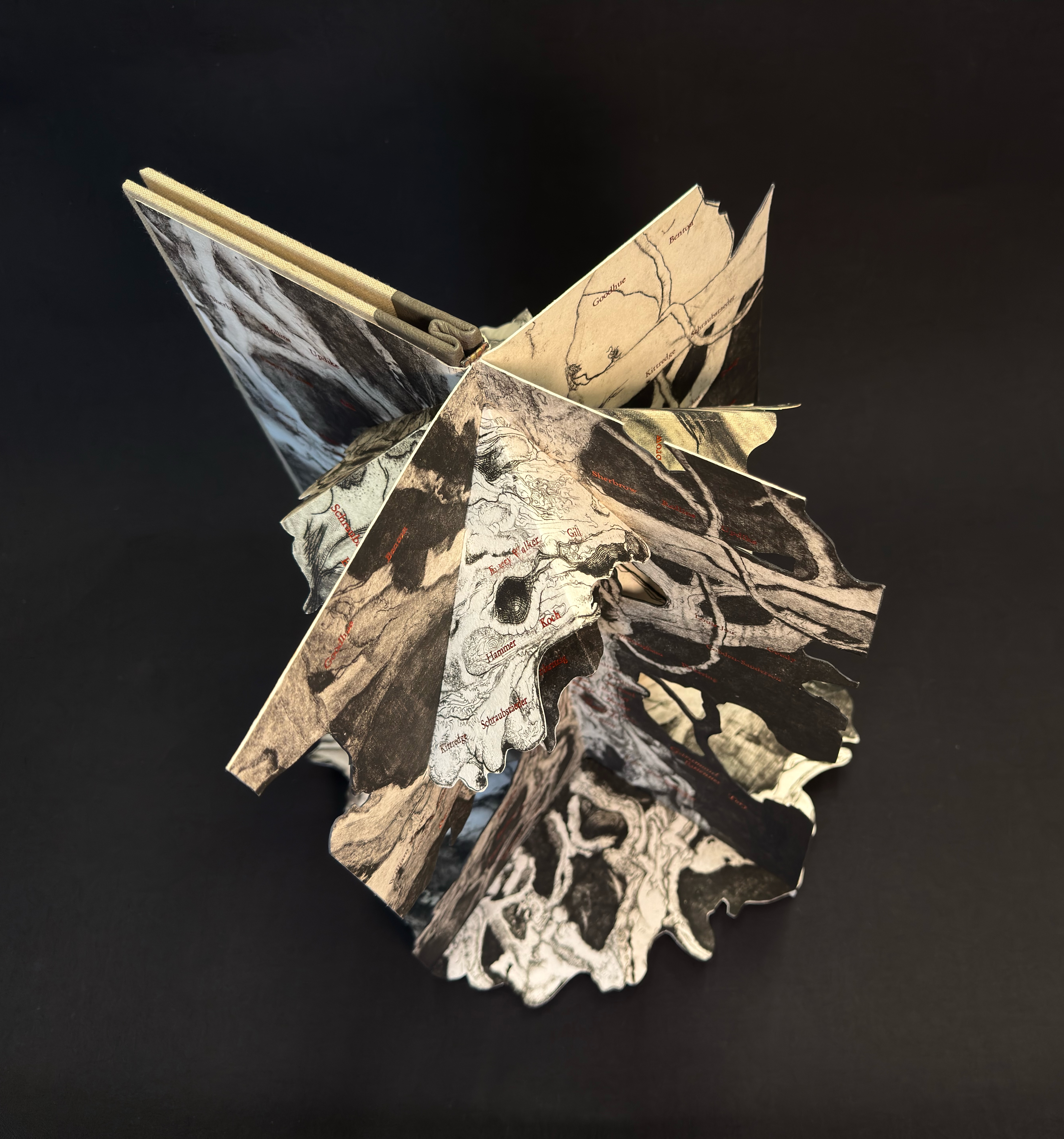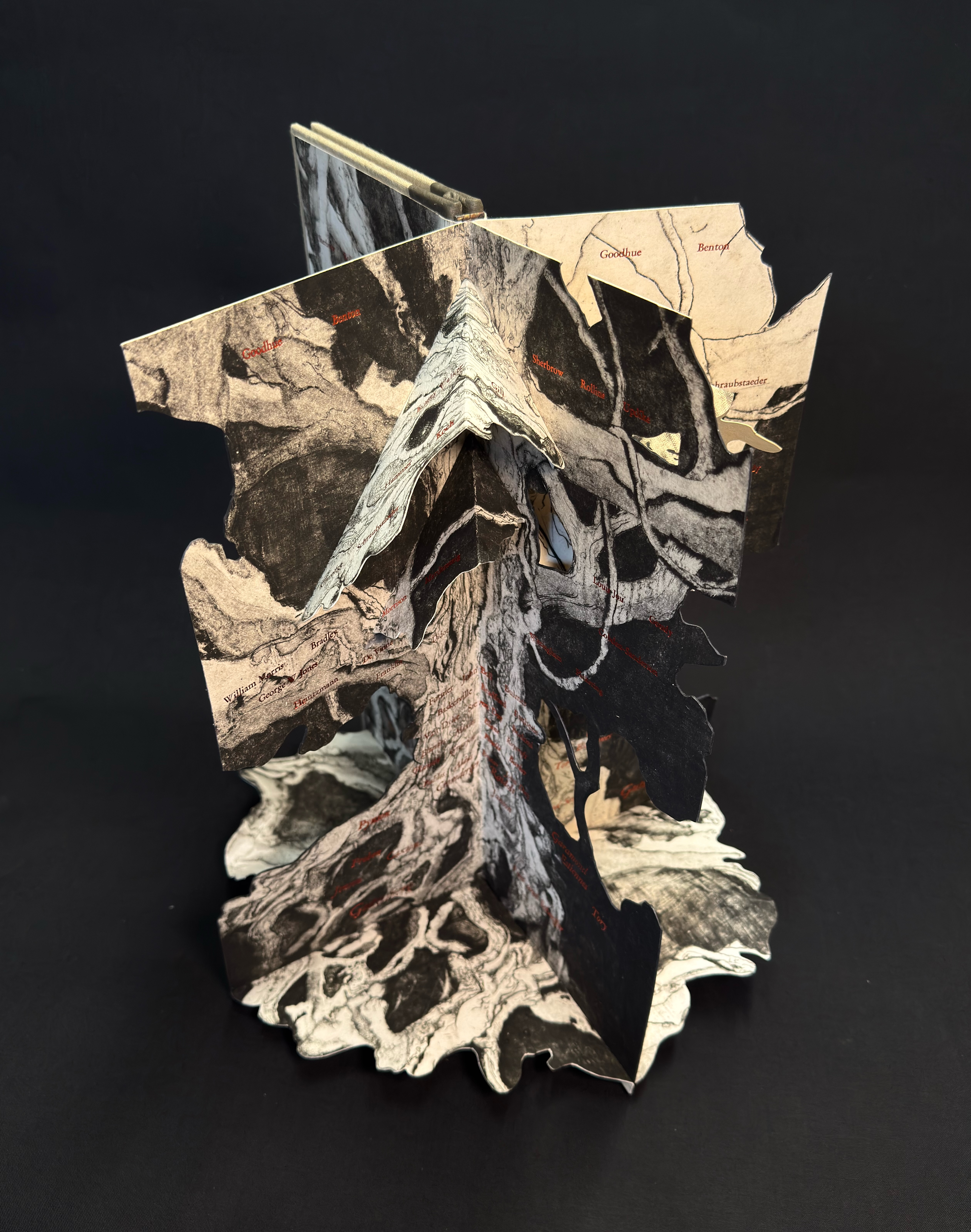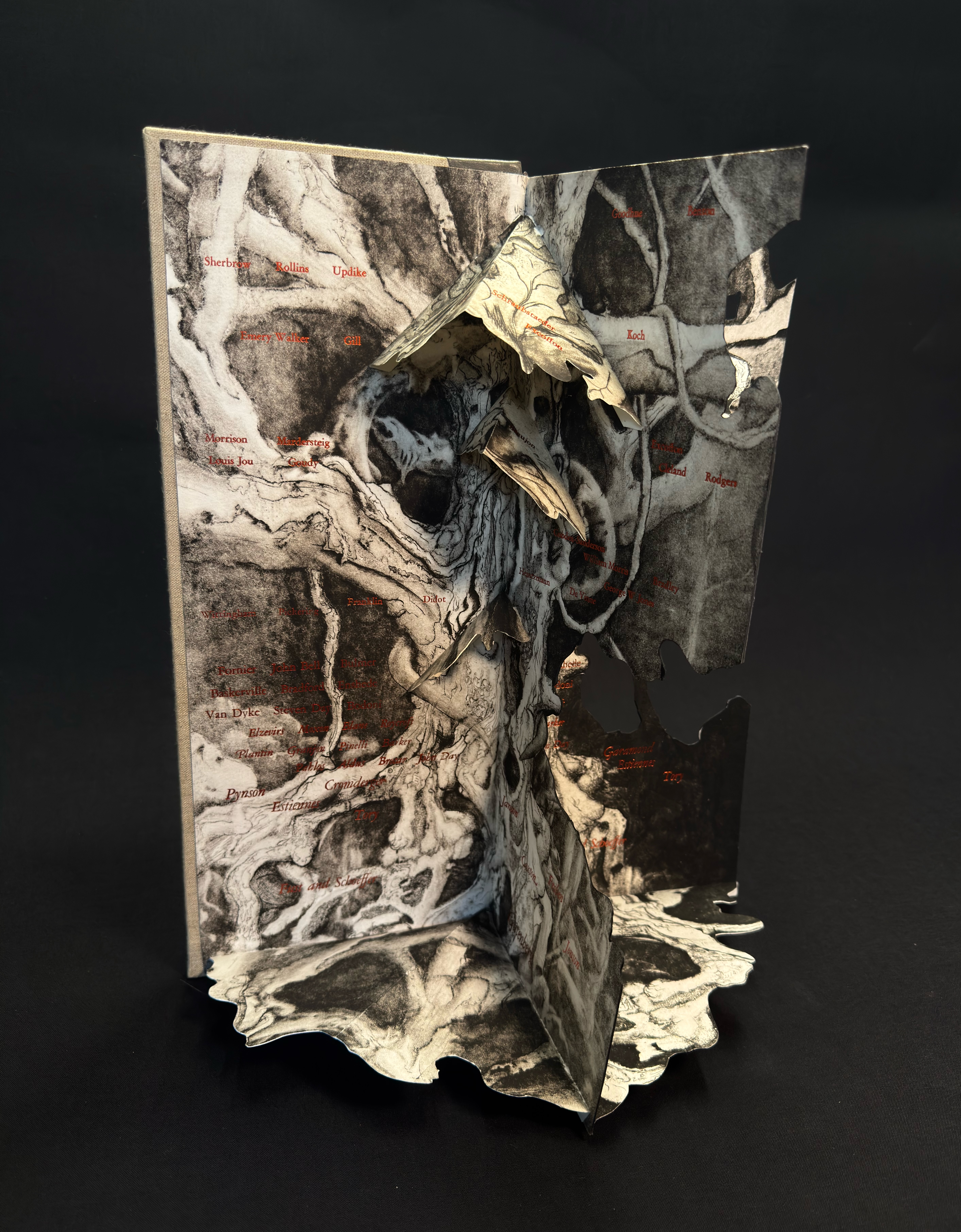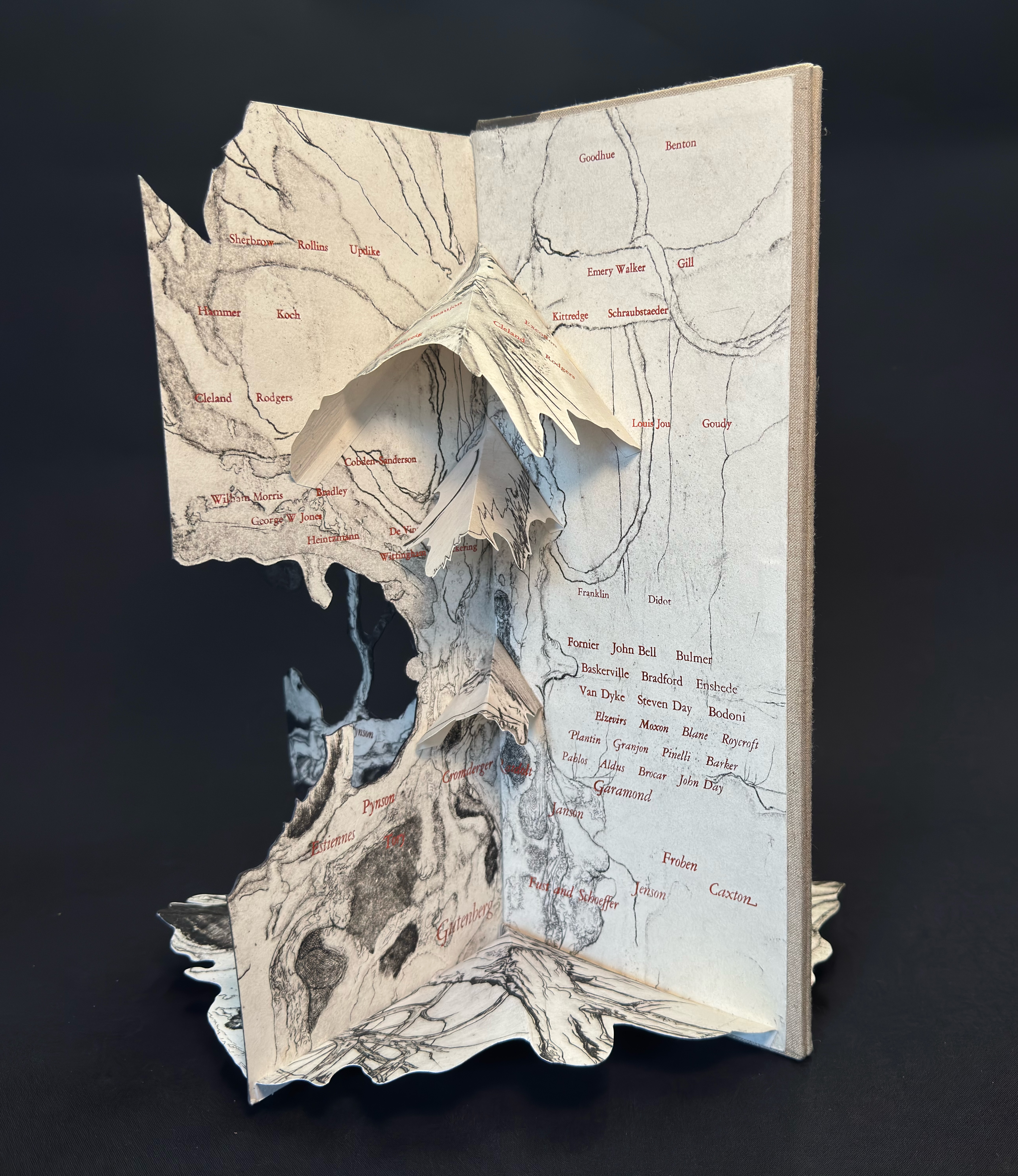 Going through my old copper plates I noted the symmetry of the tree on this 12 ¾ x 15 ½” (31.5x39cm) image and after I found my old proofs I immediately started cutting and folding them up into this kinetic structure. This is one of my intaglio prints that had long languished in an unfinished state when I frustrated myself with the addition of some figurative work. The first layer on the copper plate was a shallow etching but then fully worked over with mezzotint, stipple and hand engraving. The seventy names composed in Garamond and foil stamped in copper start with Gutenberg at the roots and the names chronologically ascend up the trunk and branches in some semblance of order and influence. Each quarter when fully opened includes the full list for viewing at any angle. The type is either hand set or cast on my Linotype machine for 14pt and under, the copper foil catches light nicely against the impossibly deep blacks of the mezzotint. The book requires six copies of the print for each edition, another labor of love with umber/black coarse hand made intaglio ink.