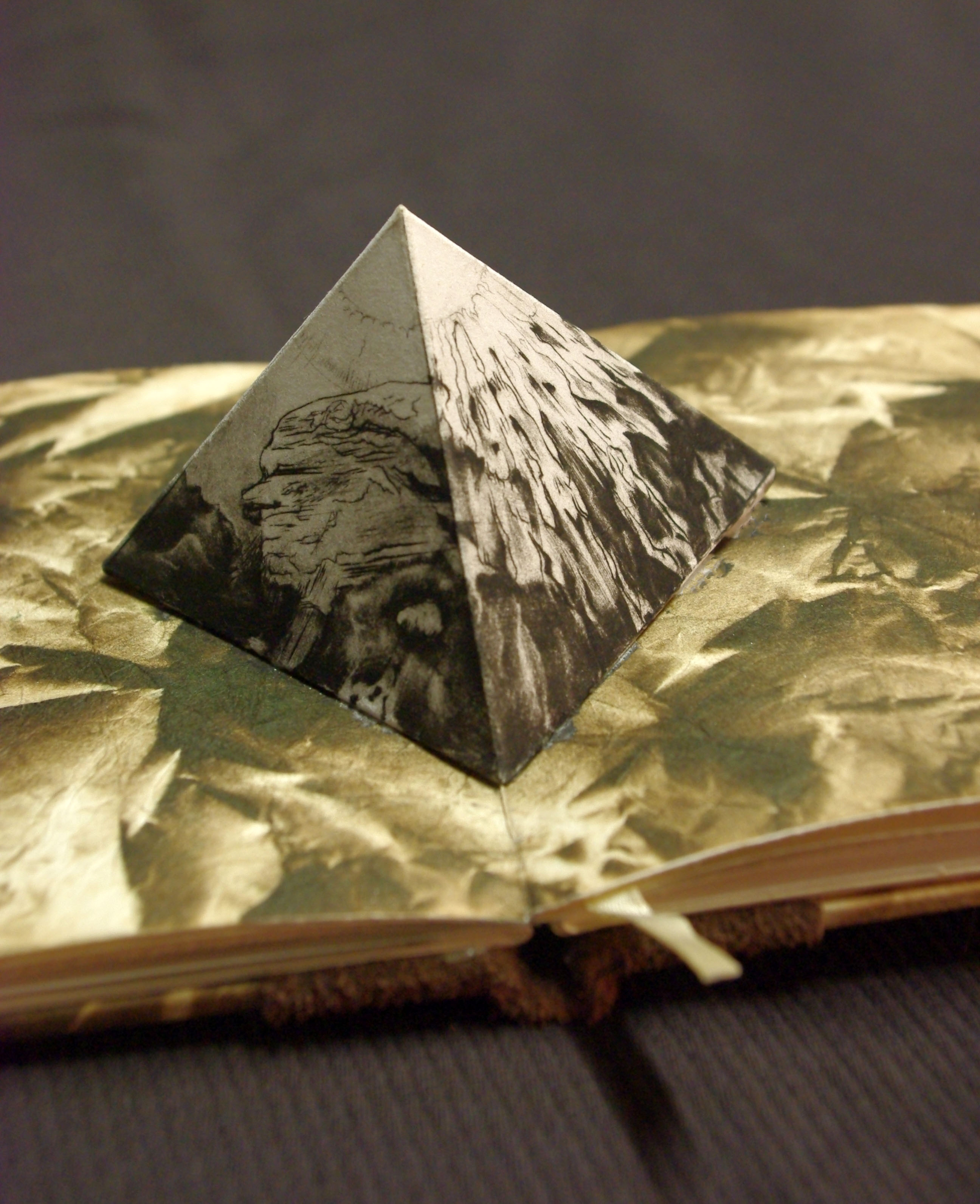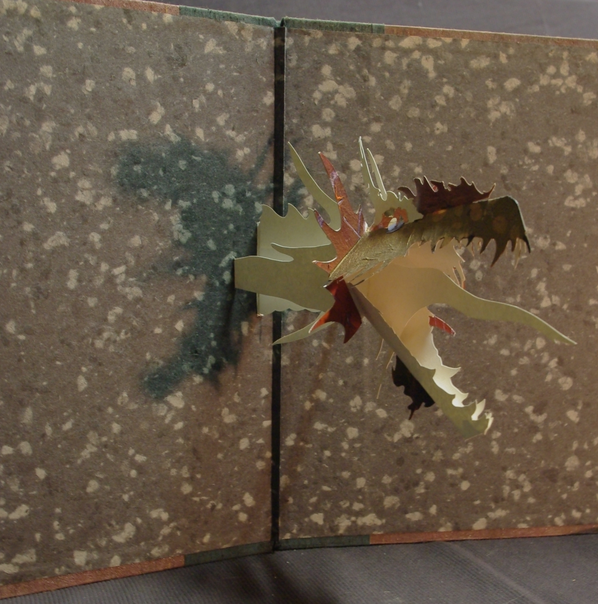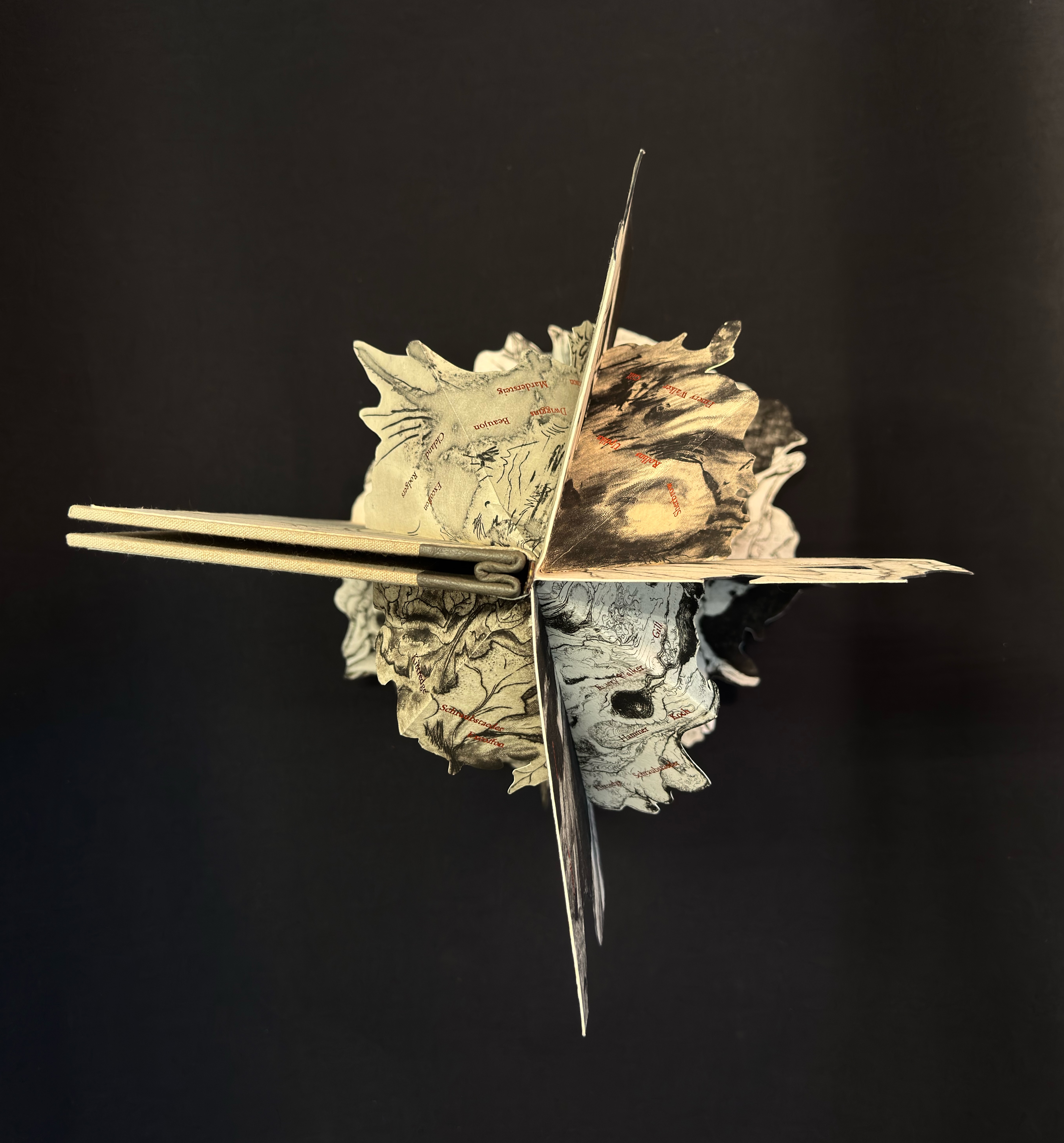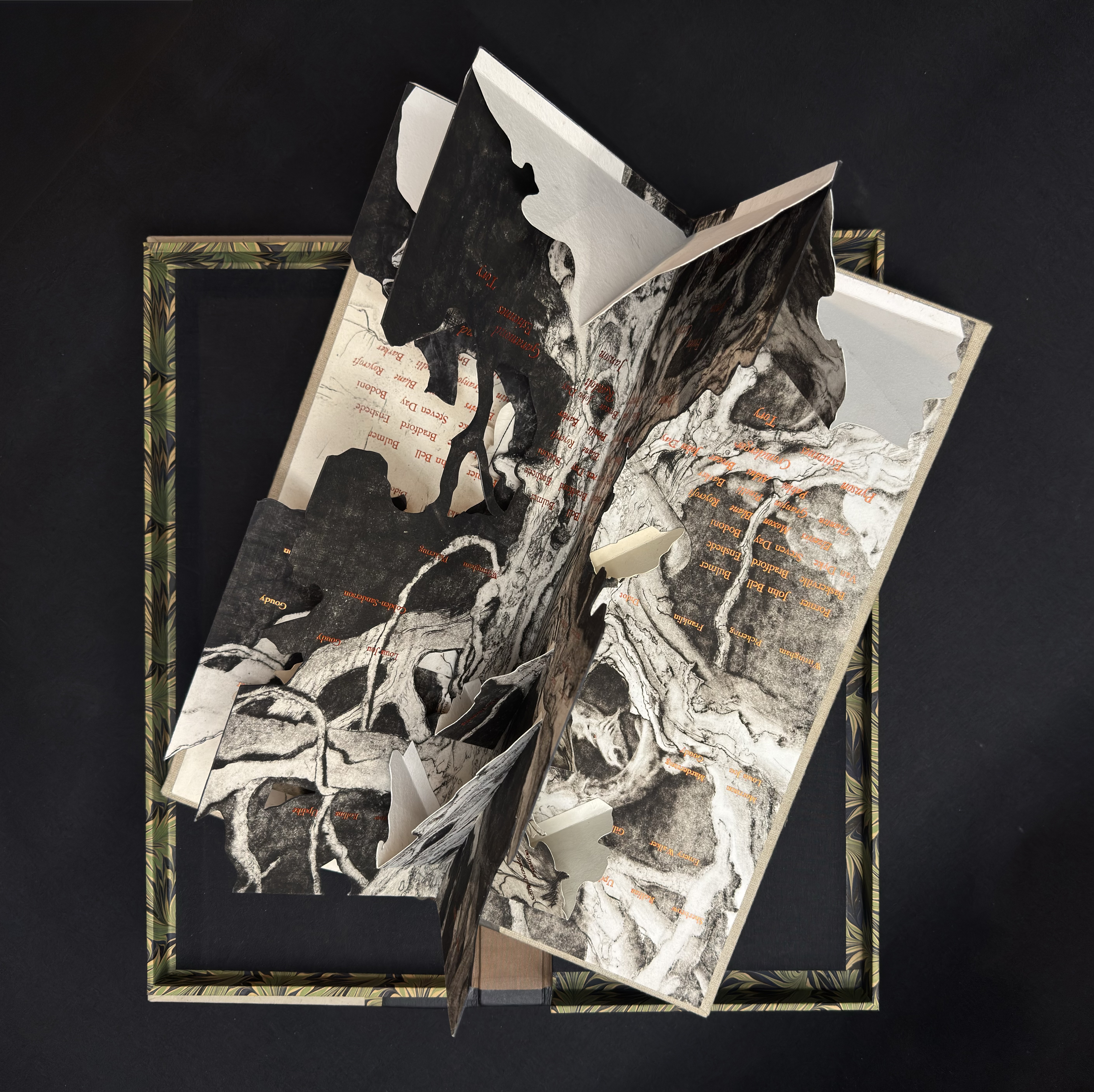 Going through my old copper plates I noted the symmetry of the tree on this 12 ¾ x 15 ½” (31.5x39cm) image and after I found my old proofs I immediately started cutting and folding them up into this kinetic structure. This is one of my intaglio prints that had long languished in an unfinished state when I frustrated myself with the addition of some figurative work. The first layer on the copper plate was a shallow etching but then fully worked over with mezzotint, stipple and hand engraving. The seventy names composed in Garamond and foil stamped in copper start with Gutenberg at the roots and the names chronologically ascend up the trunk and branches in some semblance of order and influence. Each quarter when fully opened includes the full list for viewing at any angle. The type is either hand set or cast on my Linotype machine for 14pt and under, the copper foil catches light nicely against the impossibly deep blacks of the mezzotint. The book requires six copies of the print for each edition, another labor of love with umber/black coarse hand made intaglio ink.