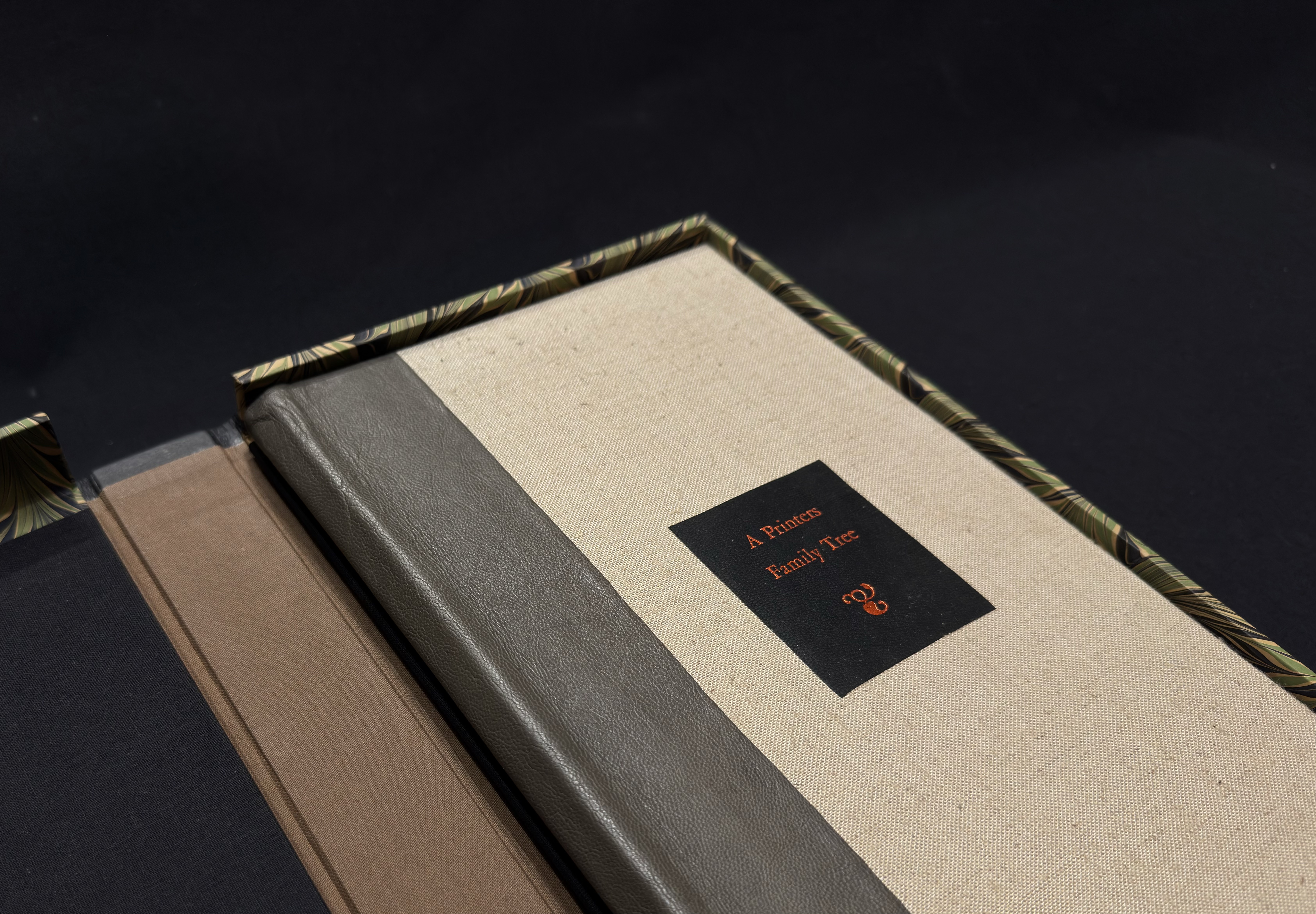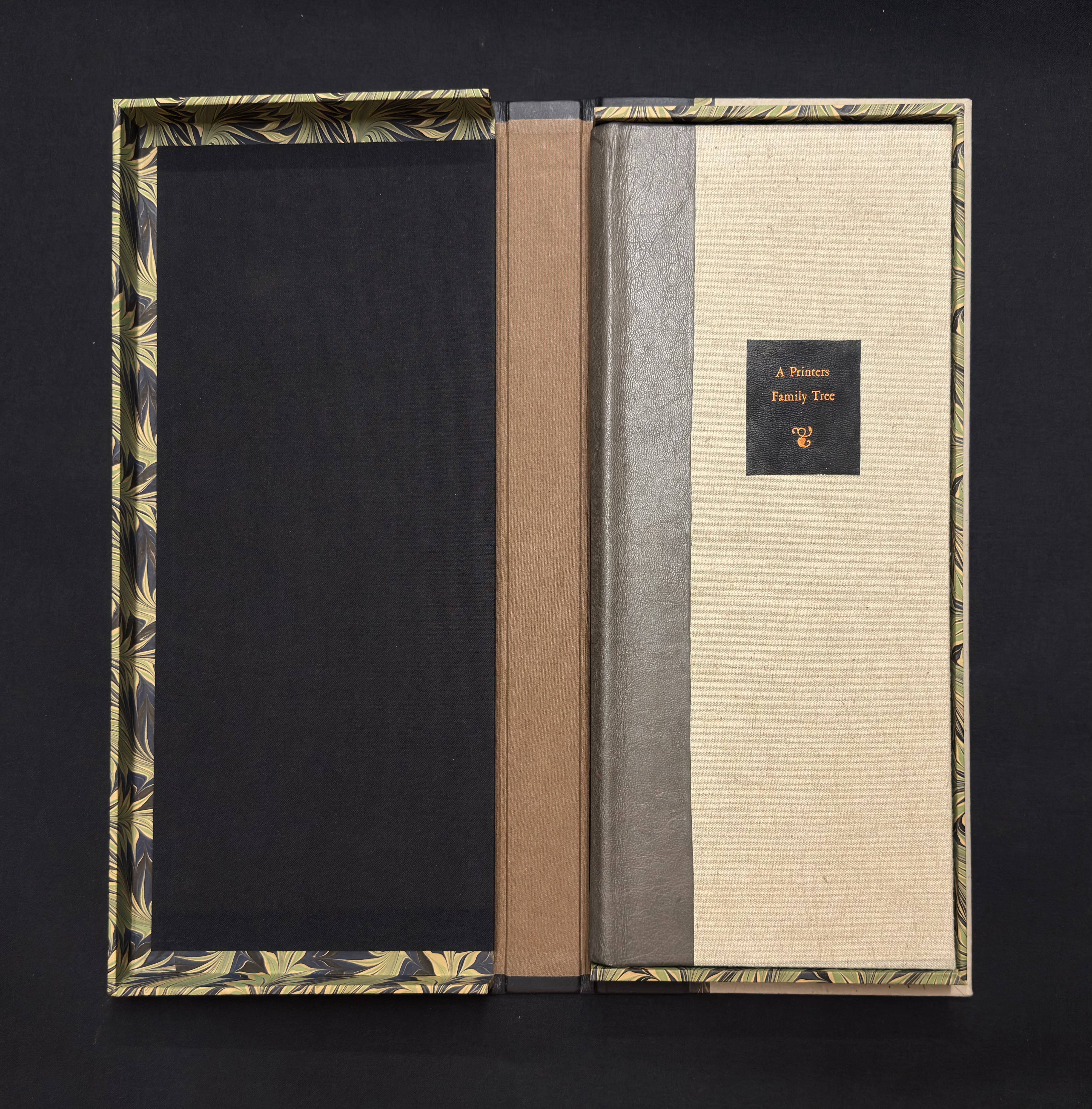 The book is covered in Asahi linen book cloth with a grey French Split goat skin on the spine. The book cover title is foiled in copper on black goat skin. It is housed in a solander box covered in Twinrocker Rustler paper with a black pebble grained goat spine foiled in copper which has a title on the cover that is, again, foiled in copper with another one of my small intaglio prints of a leaf and framed within a black goat border. The sidewalls and cover element are covered in Cockerell marbled paper I’ve been hoarding since Heart of Darkness. The box is 7 ¼ x 16 ¾ x 1 ½” (18.5×42.5x4cm)