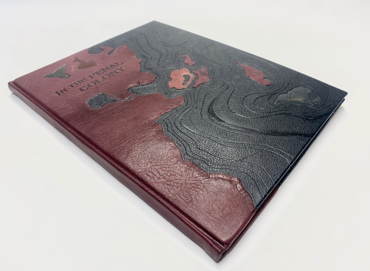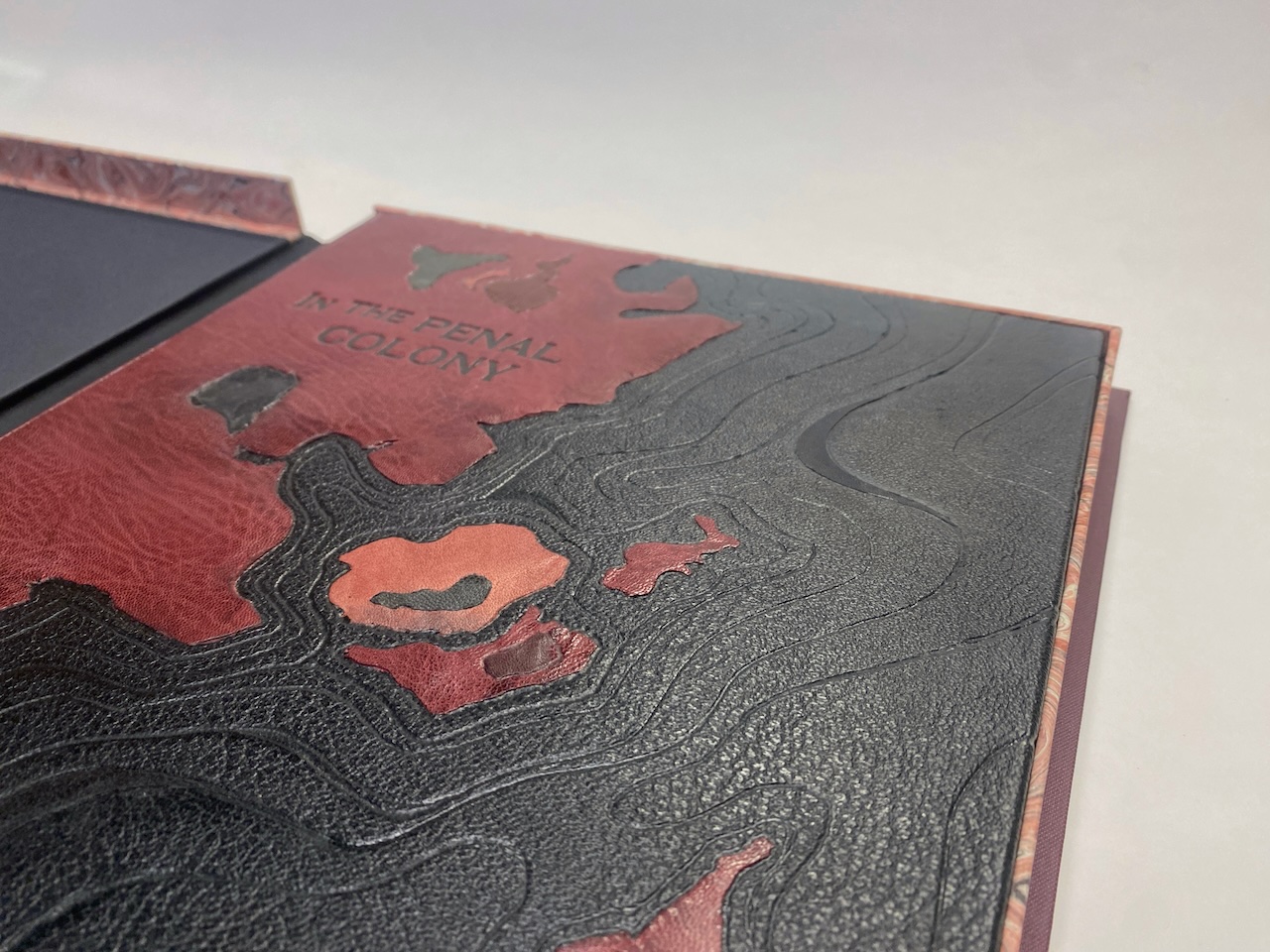Another commissioned binding for my edition of Kafka’s In the Penal Colony was recently completed for a collector in Australia. I’ve done five variations on this theme of a rugged leather coast with topographic features blind tooled into the sea for this book and I’m pleased with the way this one has evolved as well. A burgundy Sokoto goat hide for the spine and river grained goat on the boards which is heavily tooled. My usual treatment with thinly pared onlay and inlay work completes the scene. This closes the sale of the edition as well though I might be able to get a book or two from my co-conspirators on the project – Dellas Henke and Breon Mitchell (etchings and translator).