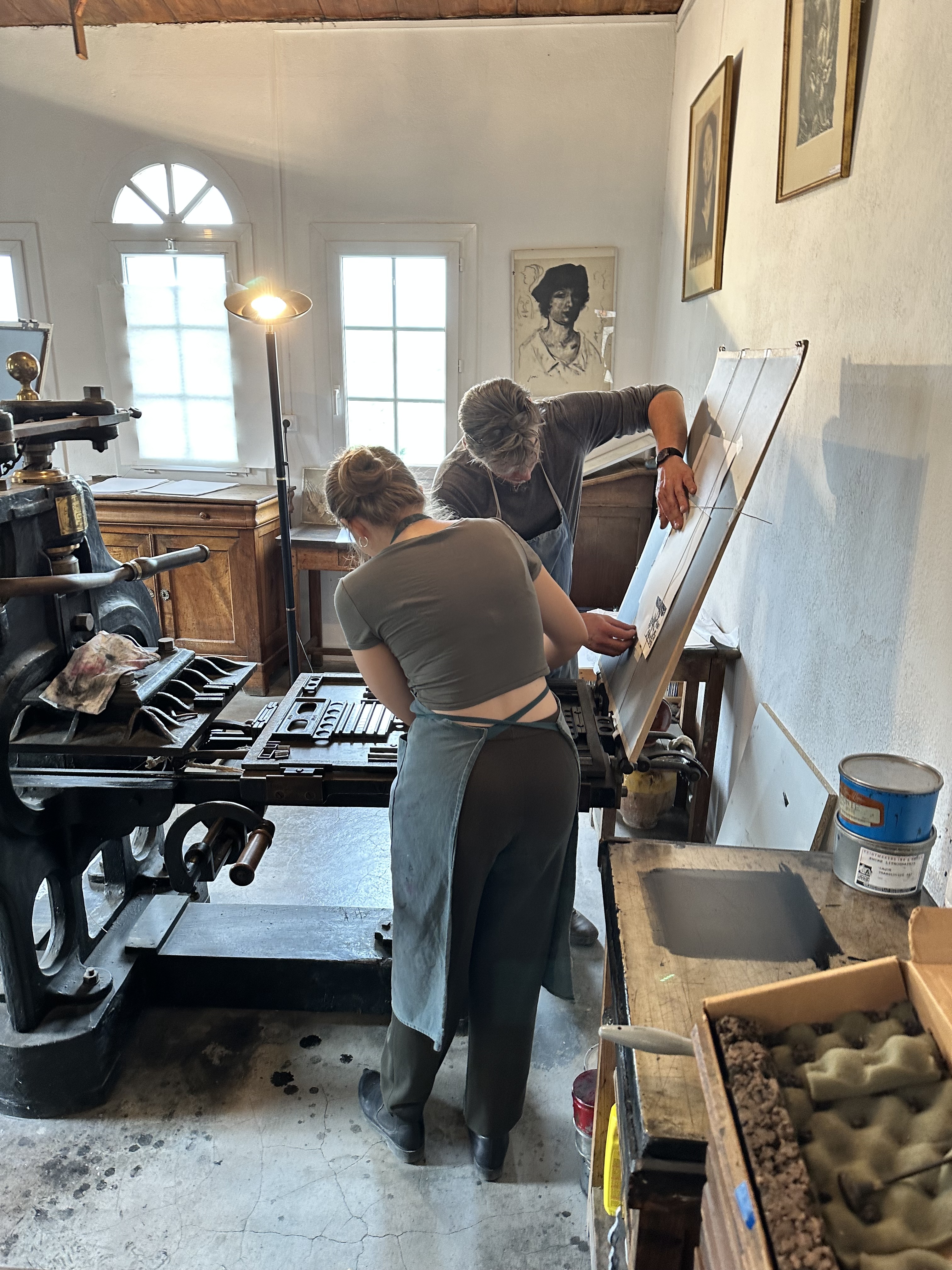 Finally, stretching back to last October in Les Baux at the Louis Jou Foundation, I taught a typography and linocut workshop for a couple students after the wood engraving class I brought Joanne Price over to teach. With both of them already possessing skills with lino cutting we dove in immediately to 2-color and reduction block work and in the period of 4 days the students came up with some very good broadsides! Working with Jou’s incredible typefaces and using his iron hand presses for production is an experience in itself. I spent a month in Les Baux last fall organizing Jou’s type, the leading and furniture and also breaking down old type forms lying around the studio gathering dust and being destroyed. While we have a supply of his type in book sizes the display type will never be able to be replaced so this was an important personal task for me to undertake. I’m pleased to say that our lovely museum is now a fully functional printing space. If Jou were to rise from the dead and return to his studio he could immediately begin production again.
