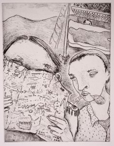 Here is Dellas’s sixth etching for the book,”Entitled” to be used as the frontispiece.