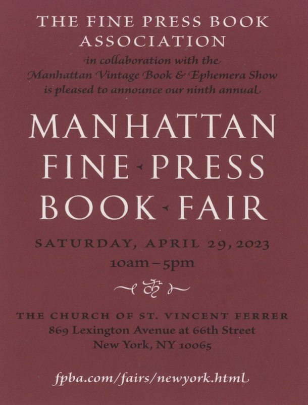 I (and Madeleine too!) will be at the eighth annual Manhattan Fine Press Book Fair next month on Saturday, April 29th from 10 AM to 5 PM. Our event is at the Church of St. Vincent Ferrer, 869 Lexington Ave at 66th Street across the street from the NY Antiquarian Book Fair at the Park Avenue Armory.