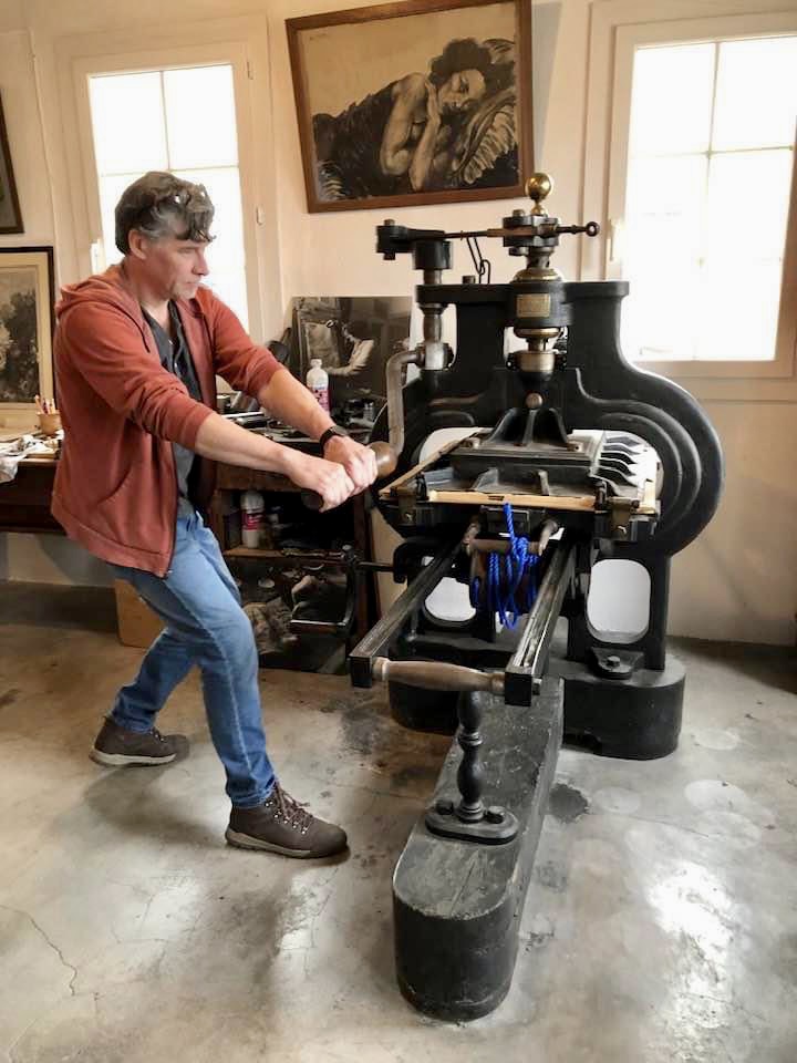 My partner, Madeleine Vedel, lived in this region of France for 20 years before we met in Northern Michigan. She and her former husband had a noted cooking school and B&B in Arles and after their separation the opportunity to establish a goat farm creamery and make cheese brought her back across the ocean with her sons. Her goat adventure behind her, she has recently created a small but thriving chocolate business. Madeleine concurrently taps her connections with artisans and locations in France to offer specialized tours (often centered around food and wine) through her Cuisine Provencale. All this back story is a lead-up to the individual who in fact made the connection for me with the Foundation: Madeleine’s friend and goat mentor Claudine, now retired from cheese making, is a docent at the Jou Foundation and encouraged us to visit. Not expecting much from this visit I was blown away by the legacy of Jou and the possibilities the space had to offer. I immediately made contact with the Foundation offering to make some needed repairs which turned into a brilliant working holiday where I became good friends with another board member and was introduced to many other printmakers, bookbinders and printers during my stay.